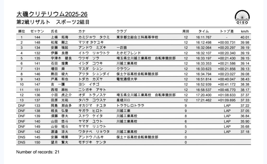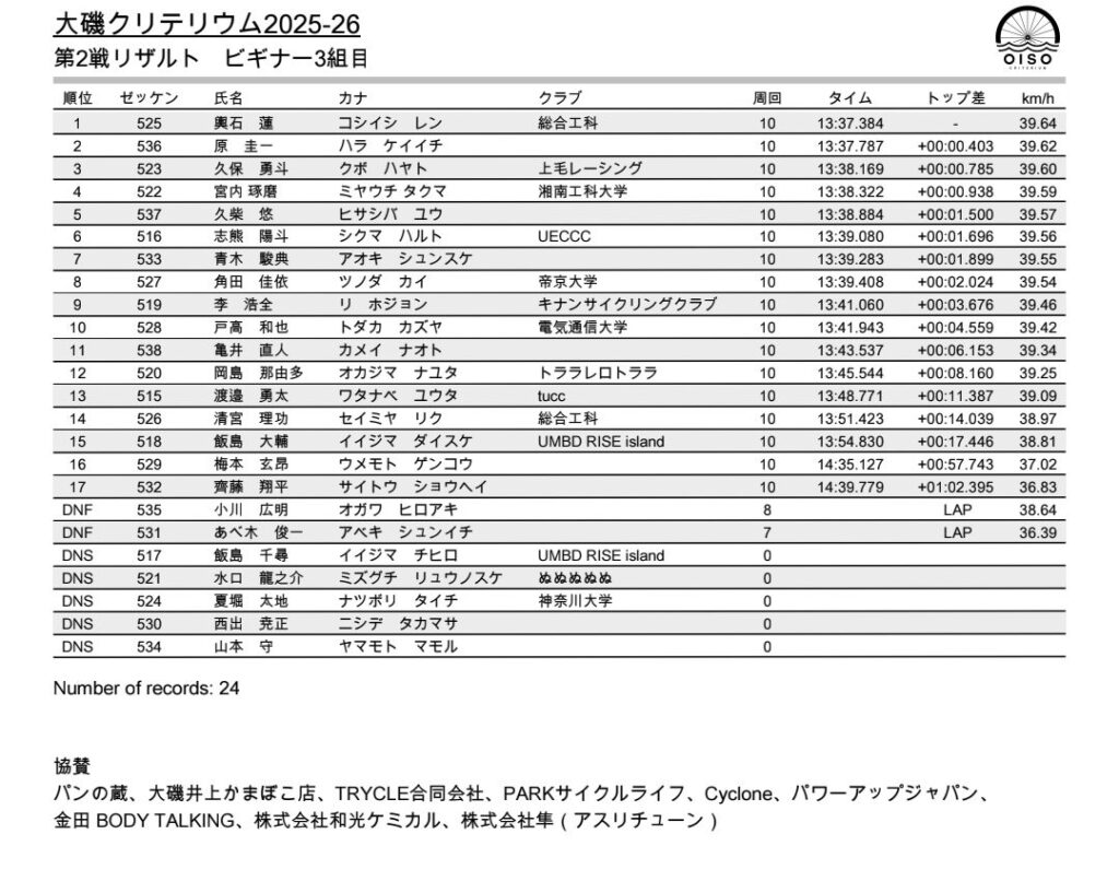 大磯クリテリウム第2戦 PTAブログ 2025.11.172025.11.19 PTAブログ部活 ooiso 大磯クリテリウム2025-26(自転車競技)第2戦が、11月16日(日)大磯ロングビーチ駐車場にて開催されました。スポーツ2組目ならびにビギナー3組目において、総工自転車競技部の生徒がそれぞれ優勝しました。