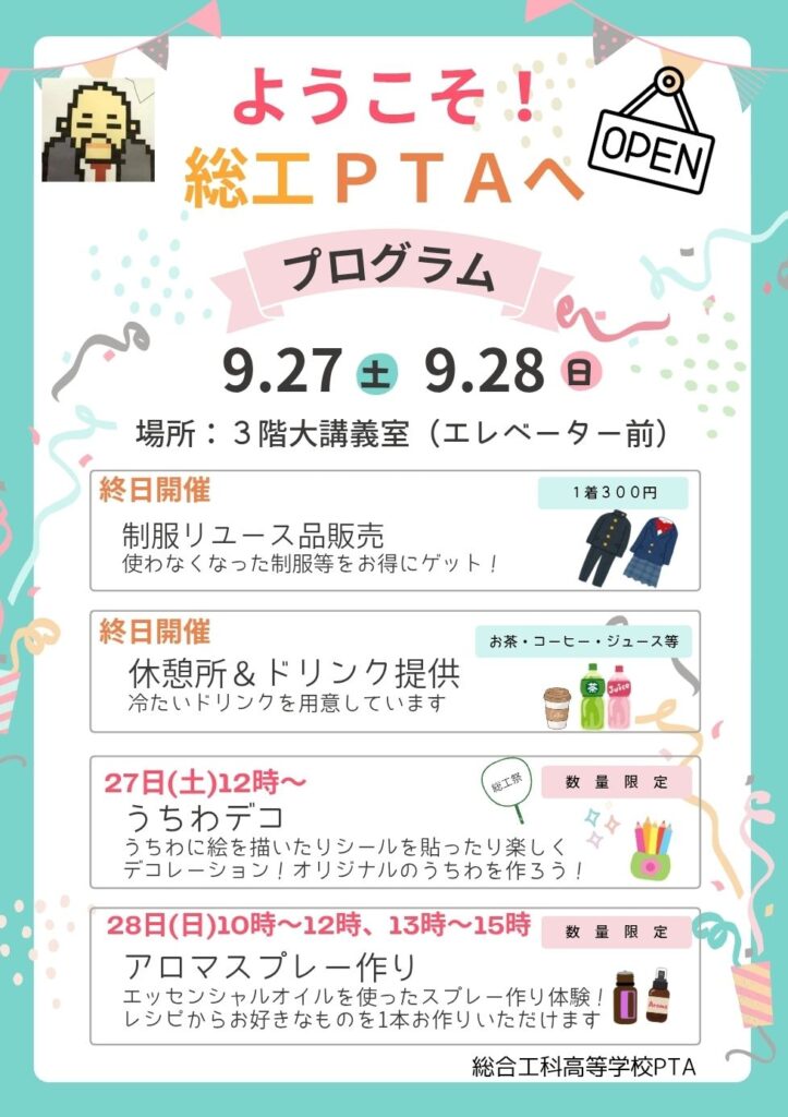明日はいよいよ総工祭となります。今年は、皆さまに楽しんでいただける企画を用意しておりますので、PTAブースにぜひお立ち寄りください。